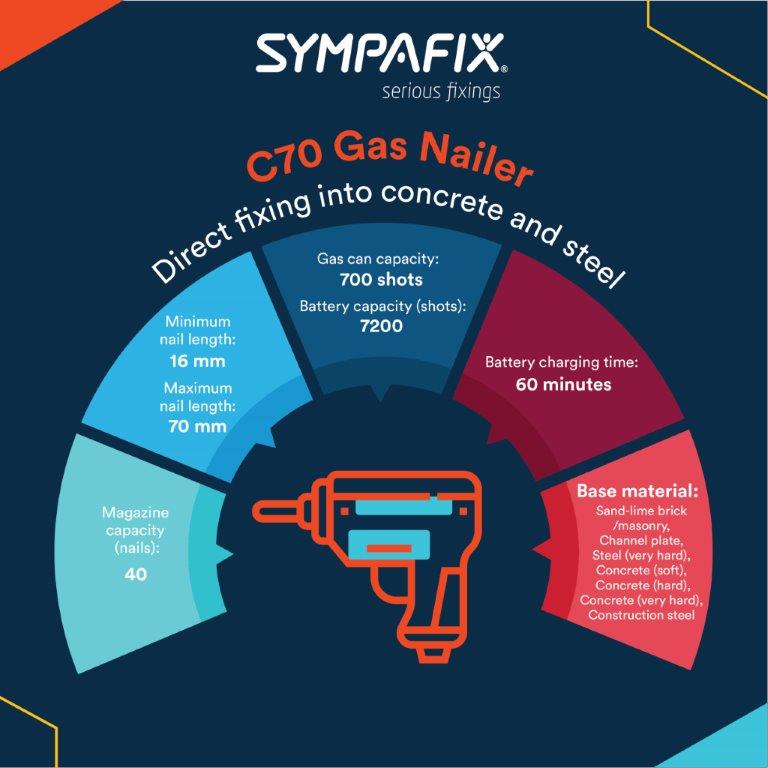 The C70 is a powerful gas nailer from Sympafix and the only gas nailer in the world that can shoot 15mm -70mm nail in to concrete, steel and brickwork.